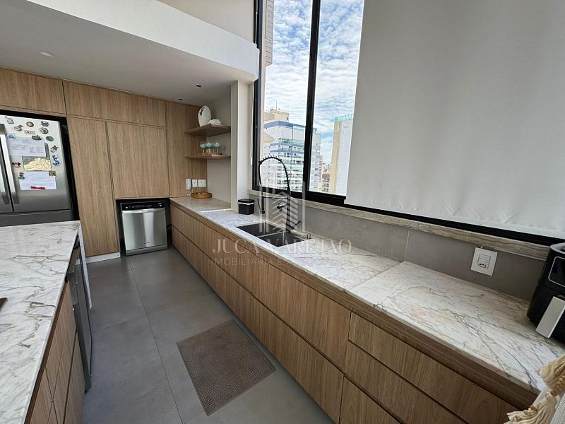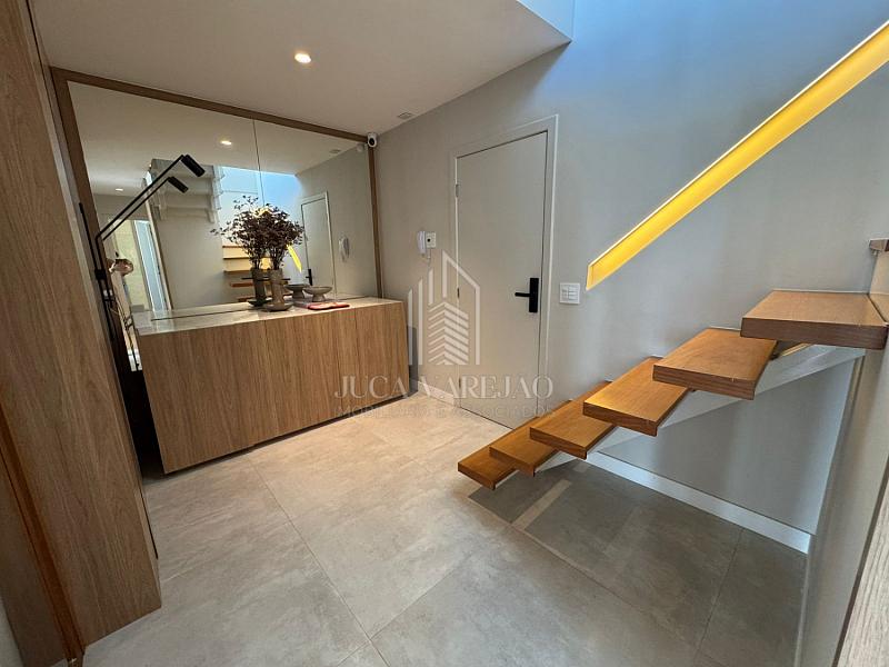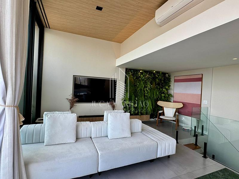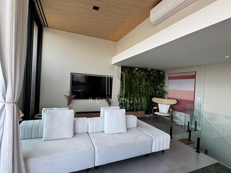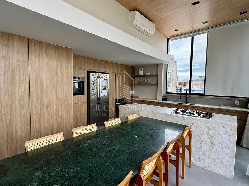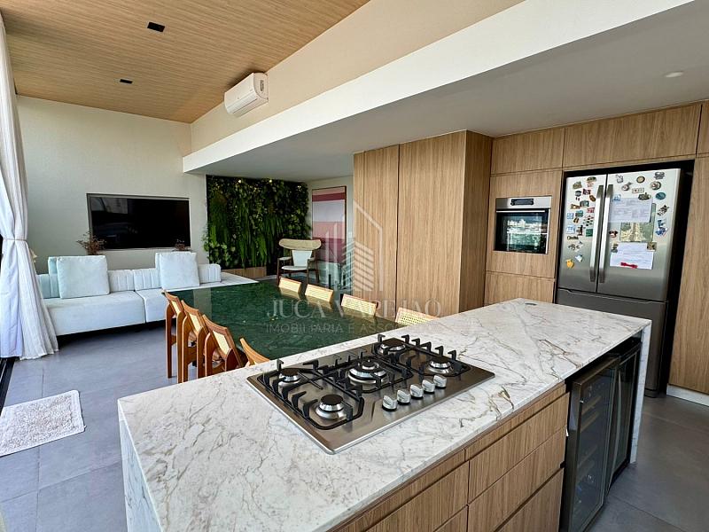 No segundo pavimento, a cozinha gourmet é espaçosa, ideal para quem gosta de receber. Além disso, o espaço conta com área de TV, piscina, churrasqueira e pé direito alto, tudo climatizado.